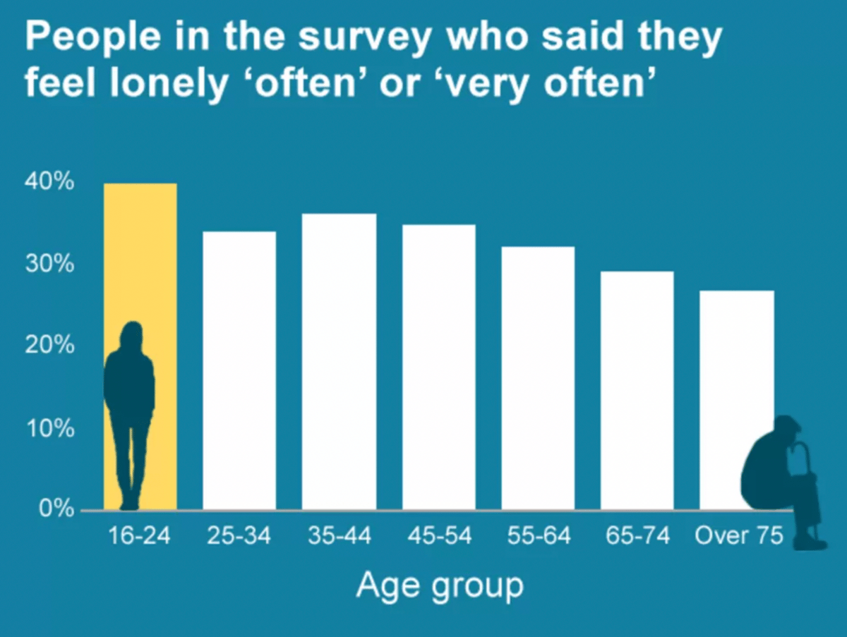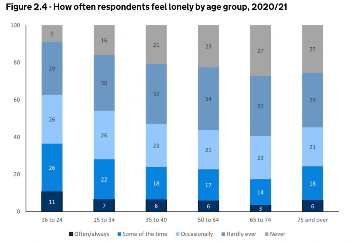 For example, in the Community Life Survey for 2020-2021, people aged 16-24 were more likely to say they feel lonely often/always (11%) than every other age group (3-7%).