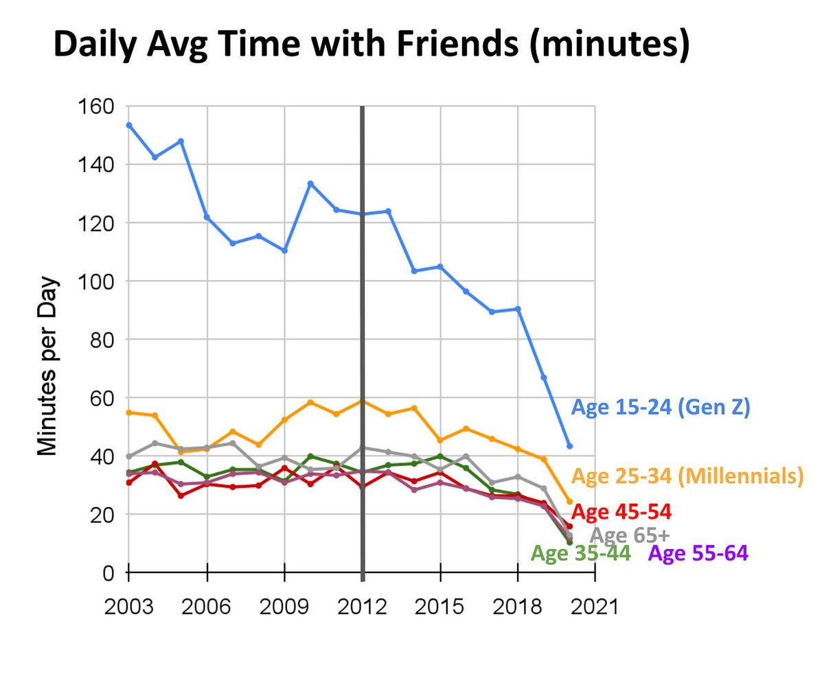 Another graph from the USA shows the decline in time spent with friends by age-group over the past 20 years. During the period 2018-2020, the Gen Z line was in free-fall: